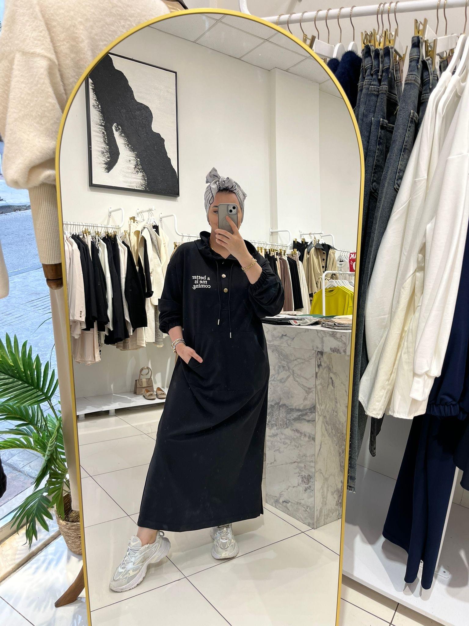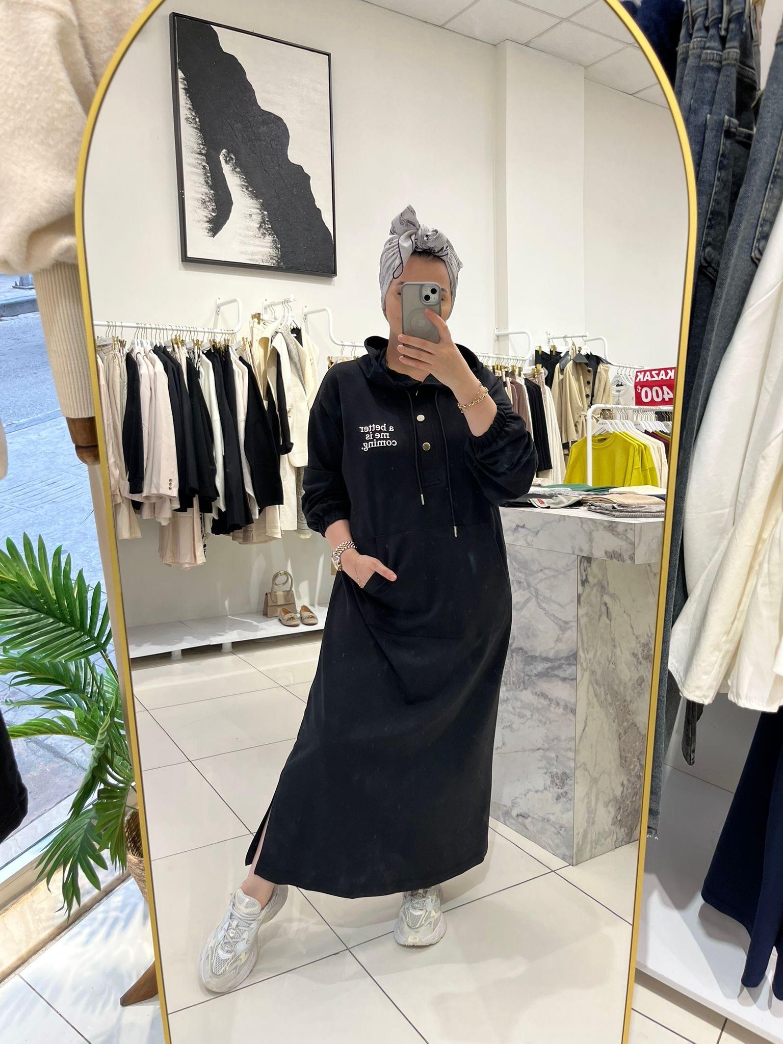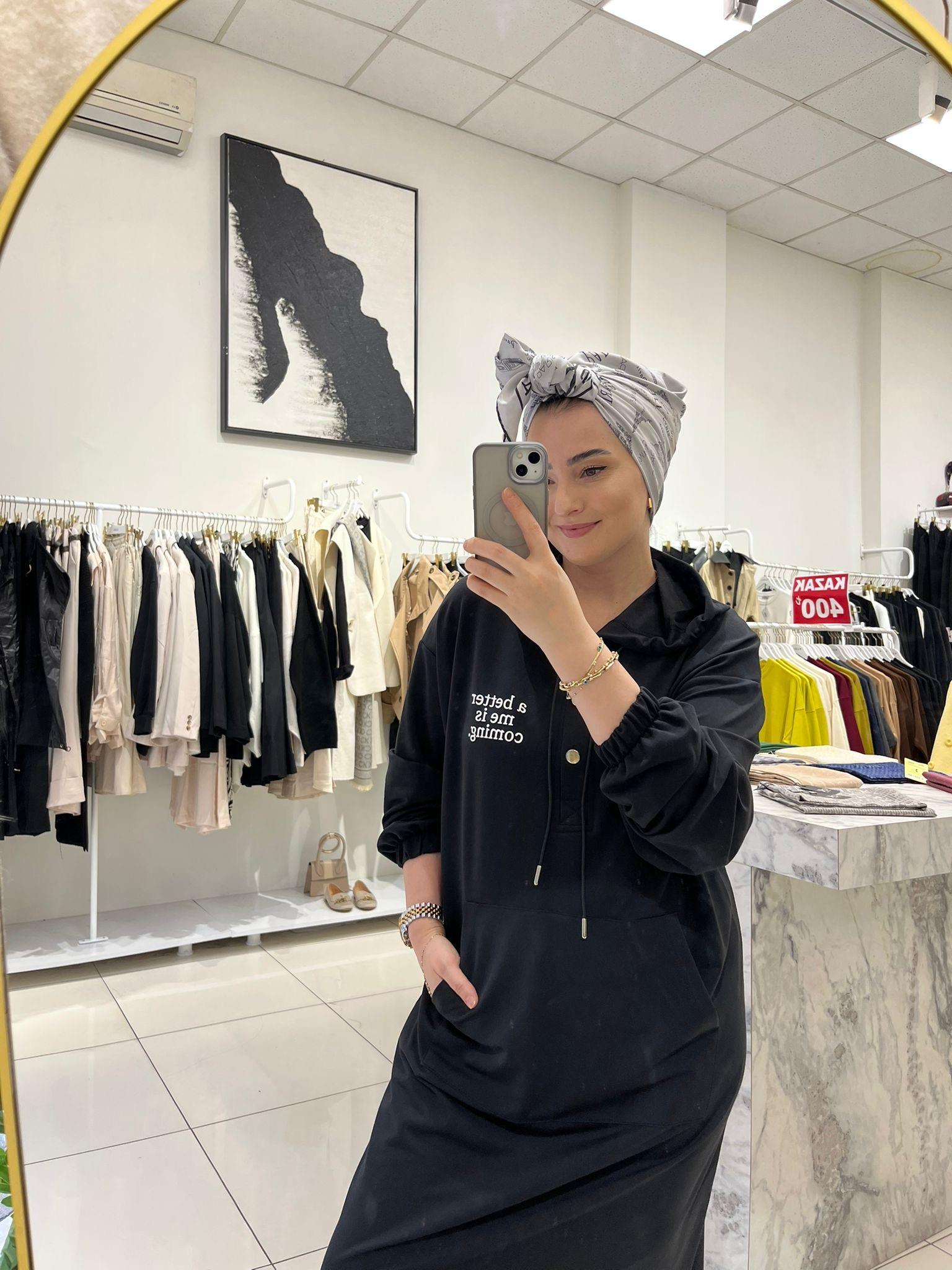 BASKILI KAPÜŞONLU MODAL ELBİSE