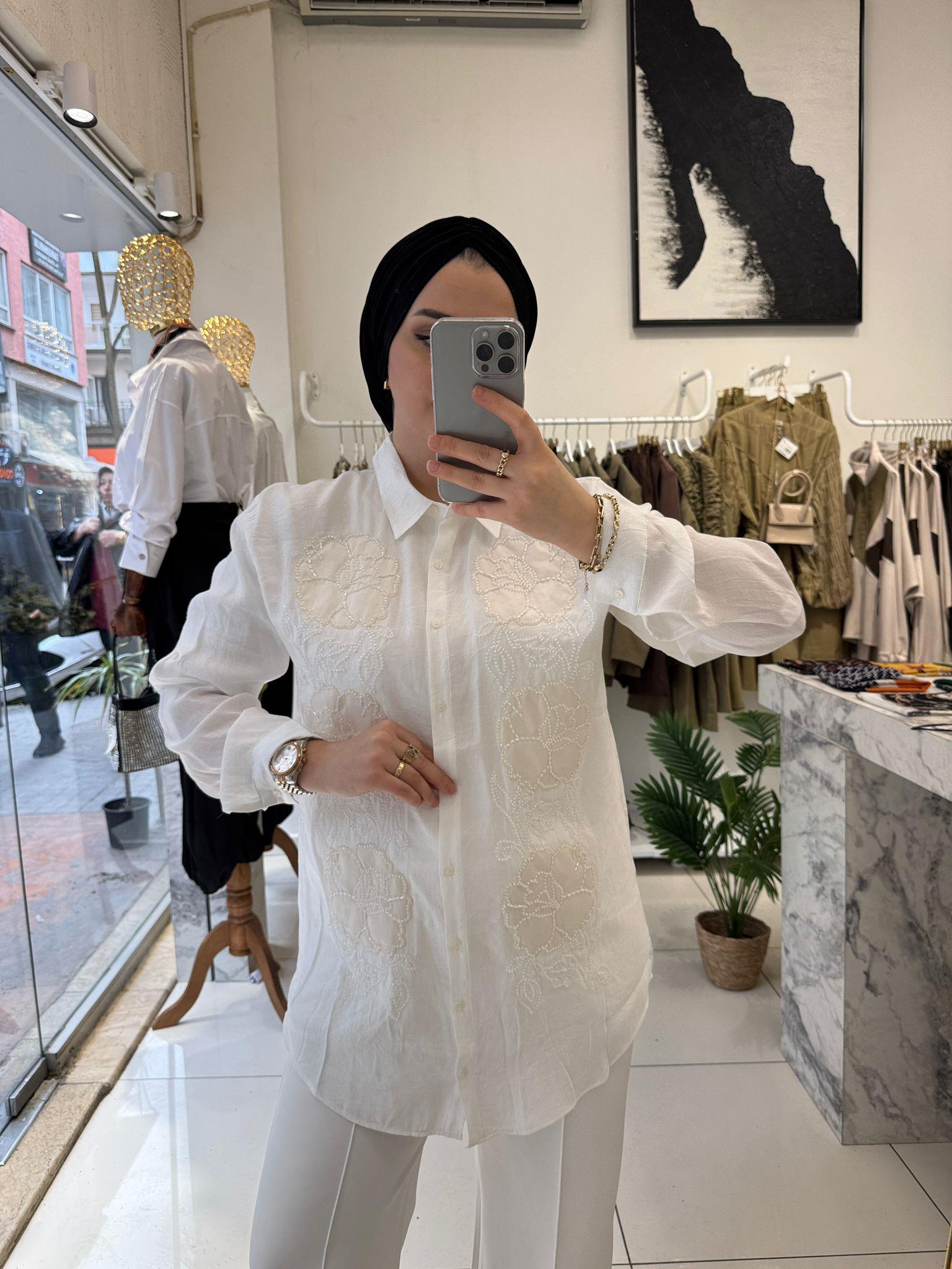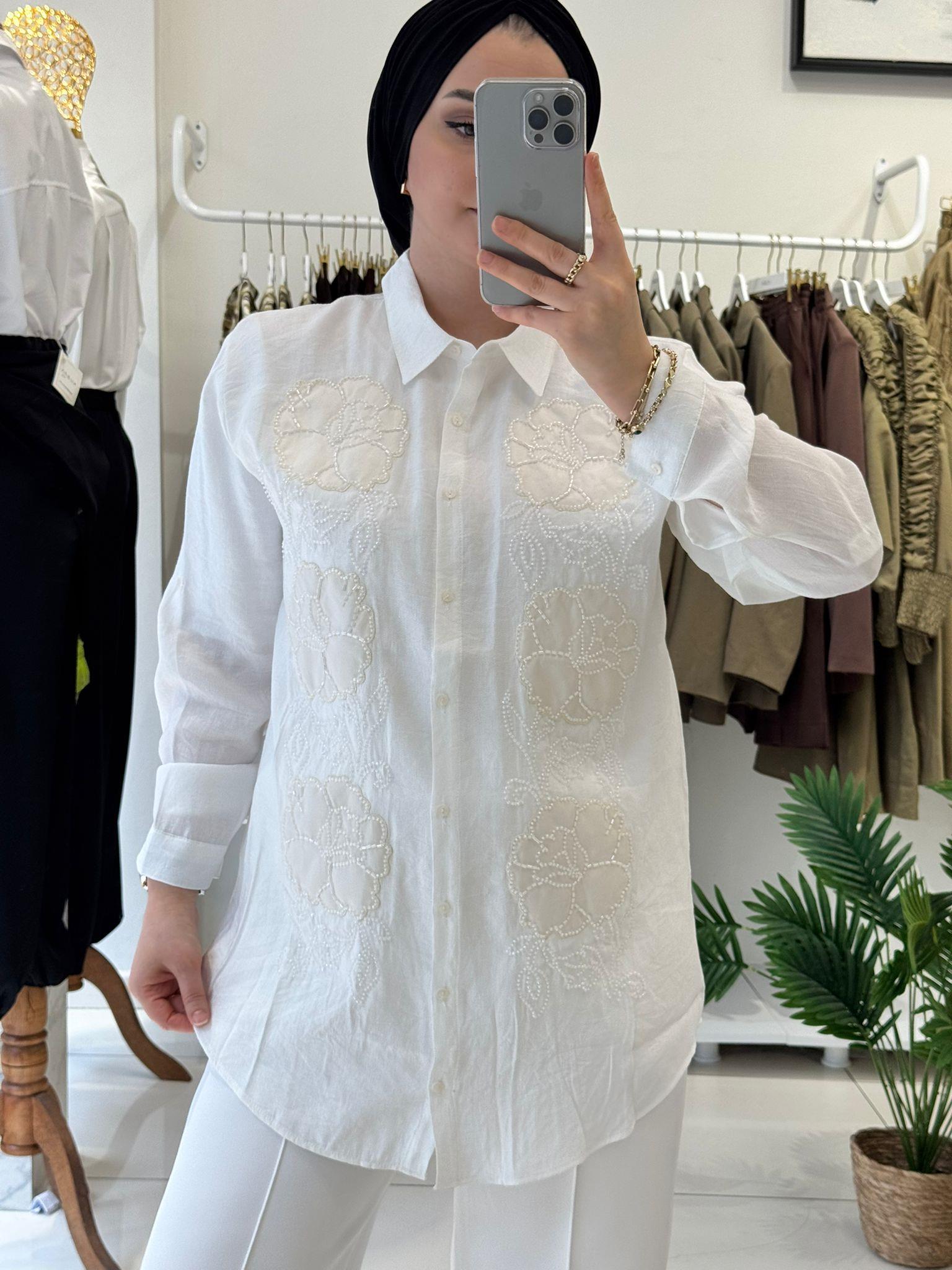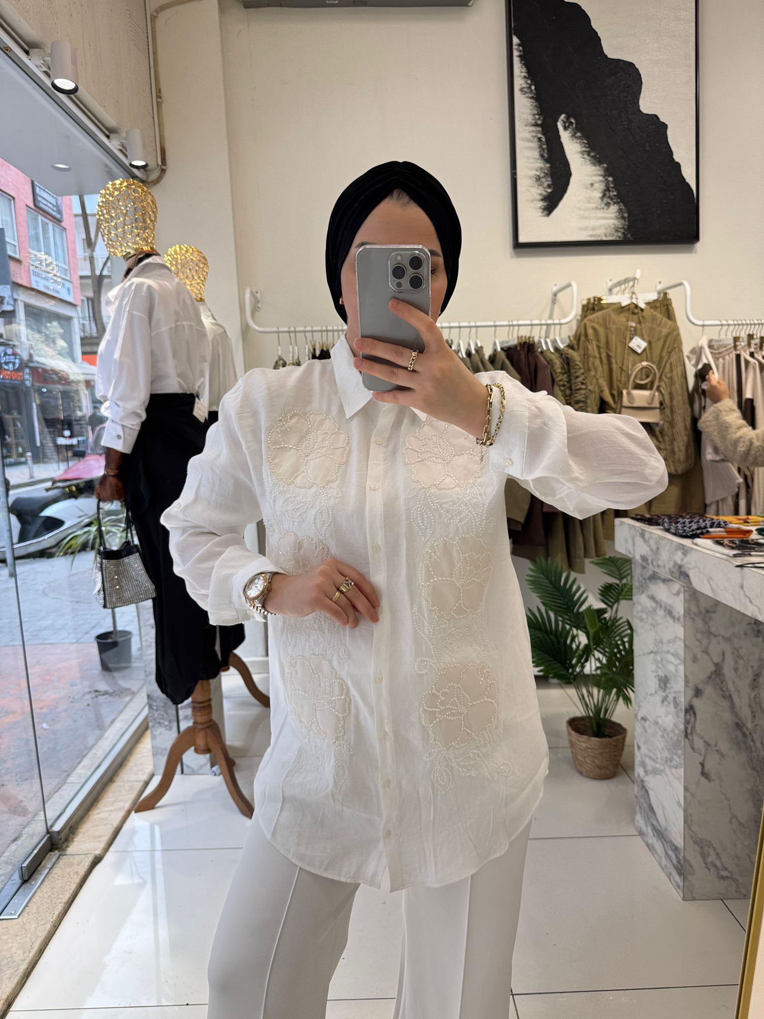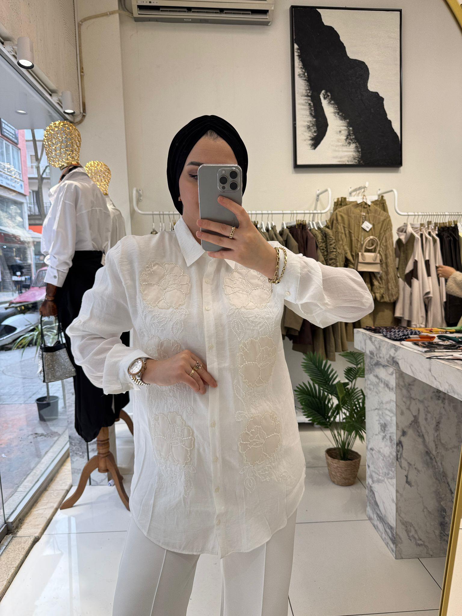 BEYAZ ÇİÇEK İŞLEMELİ AEROBİN GÖMLEK (KUB0484)