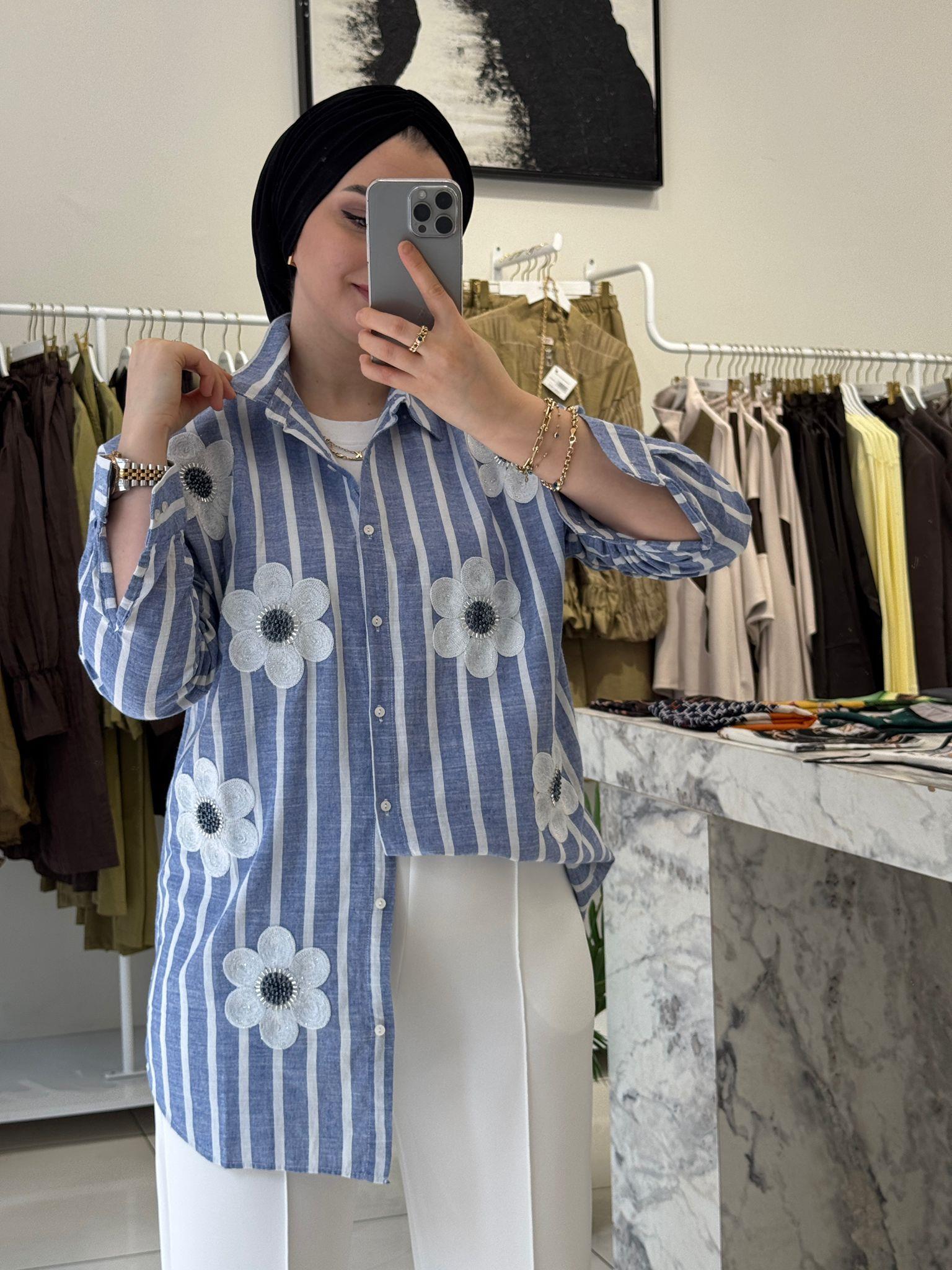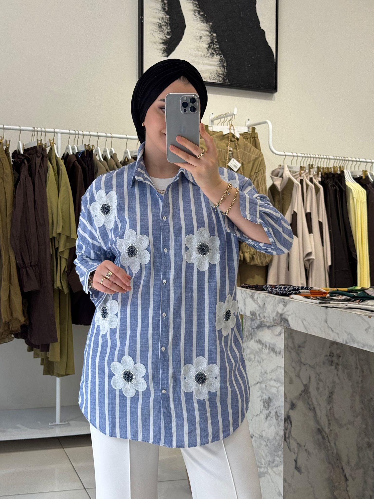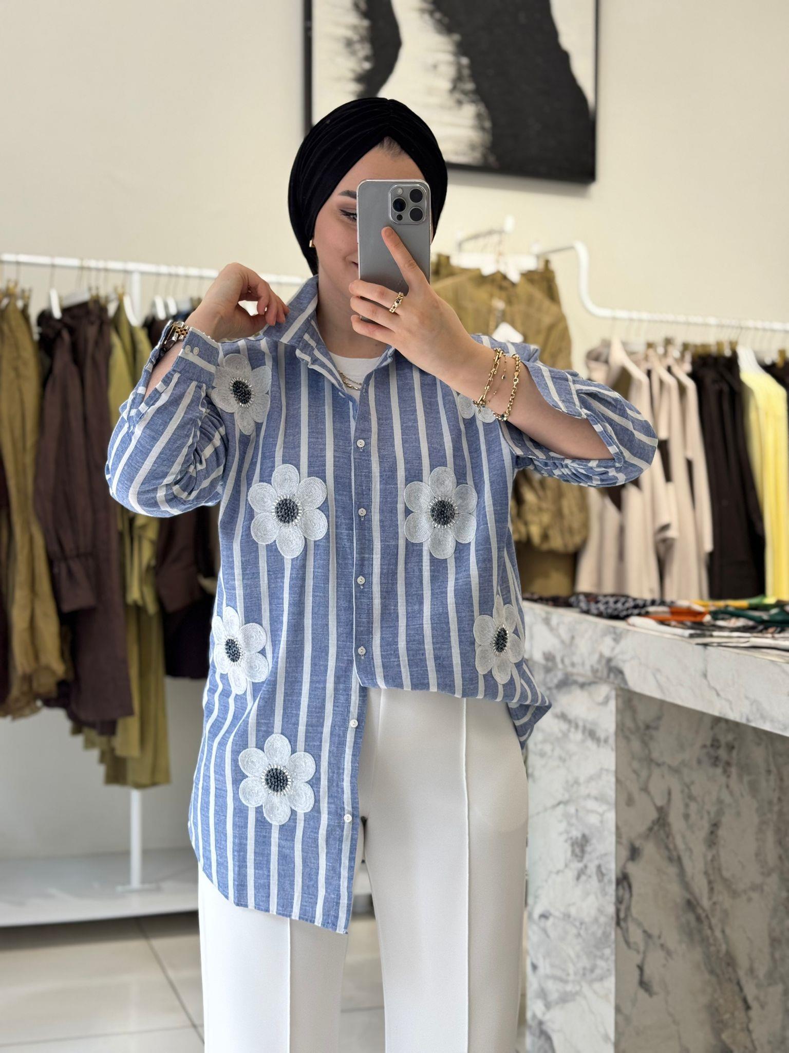 ÇİÇEK İŞLEMELİ ÇİZGİLİ  KETEN GÖMLEK