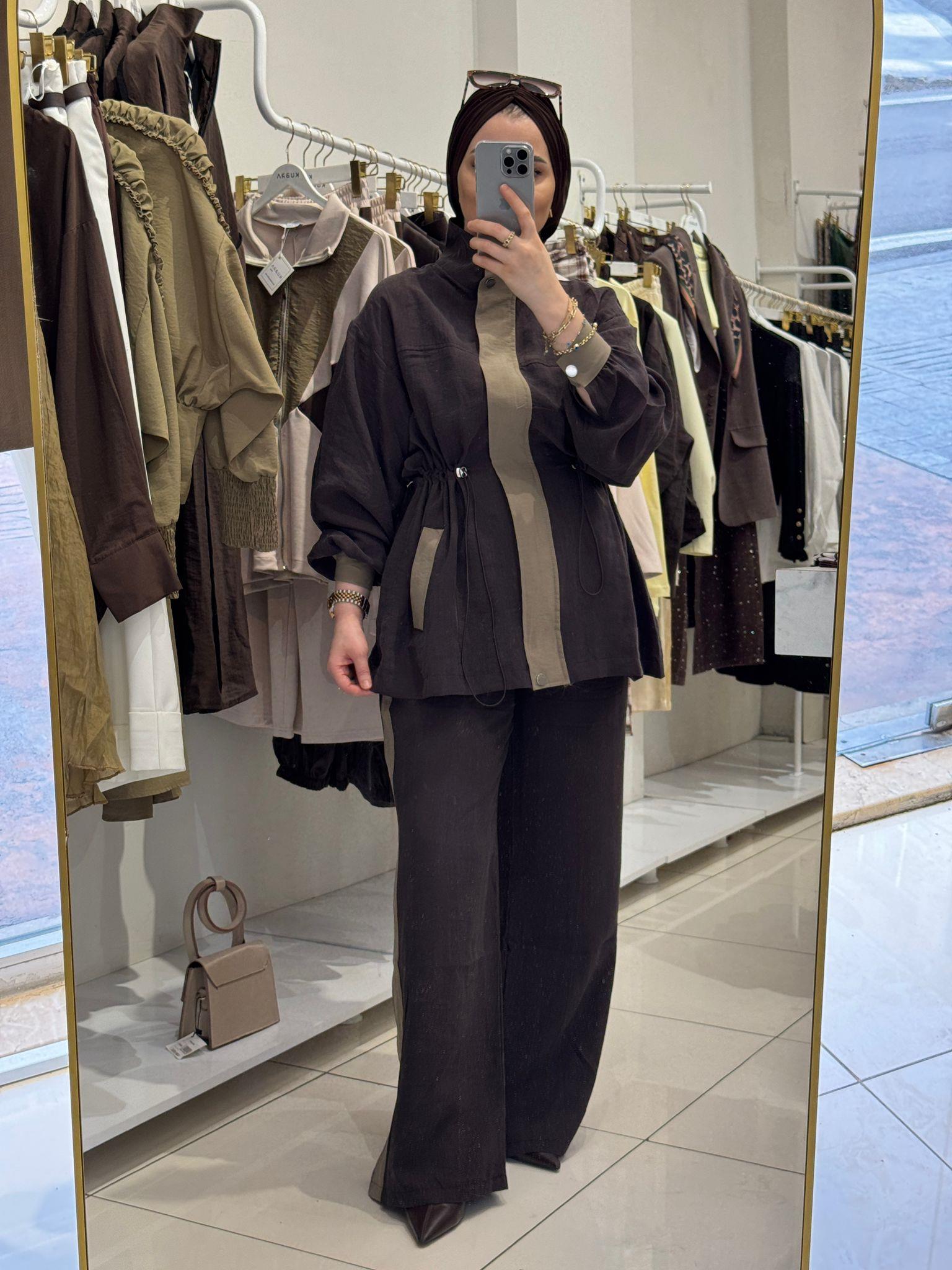 DİK YAKA BEL BÜZGÜLÜ ŞERİTLİ TAKIM