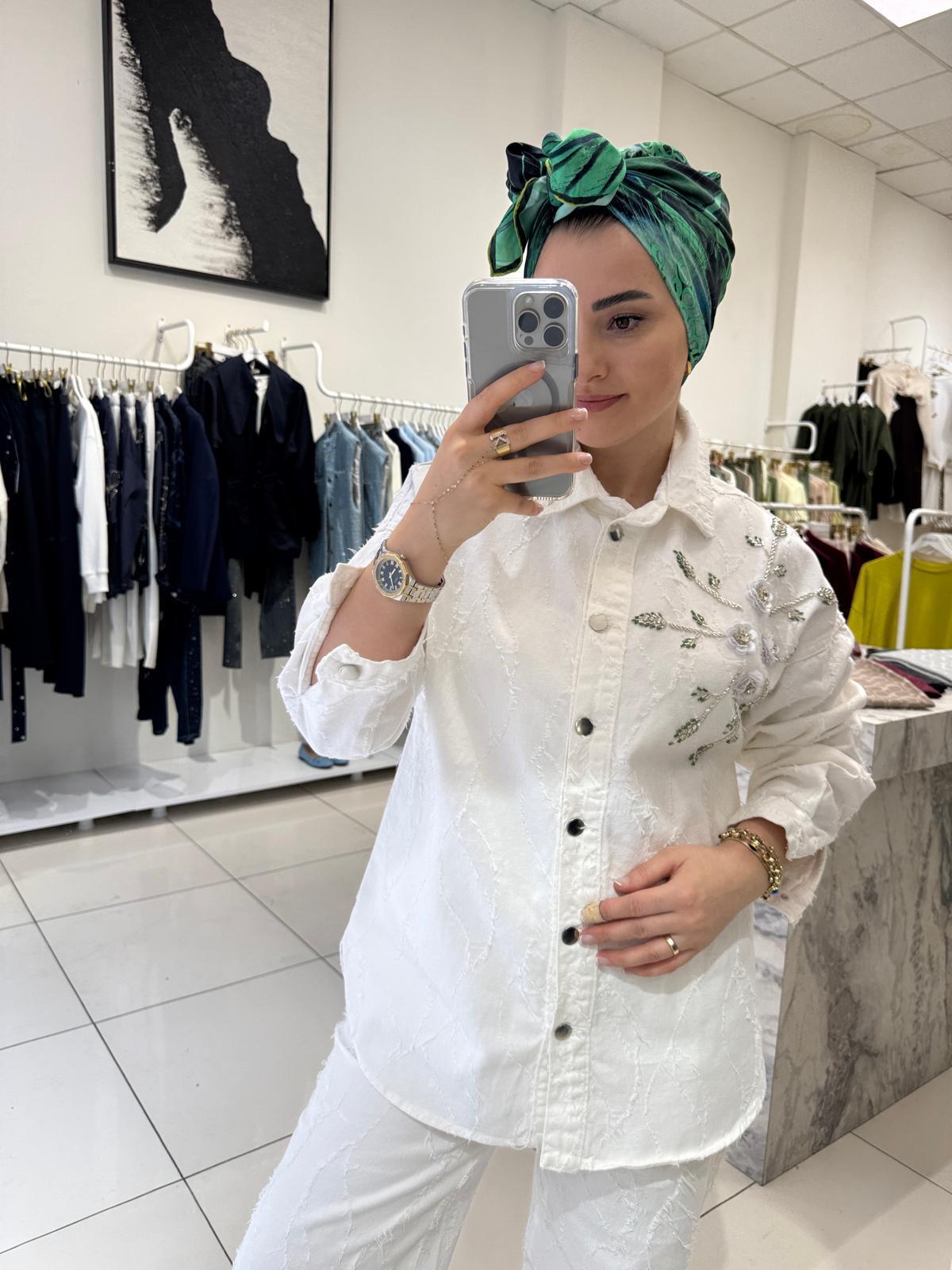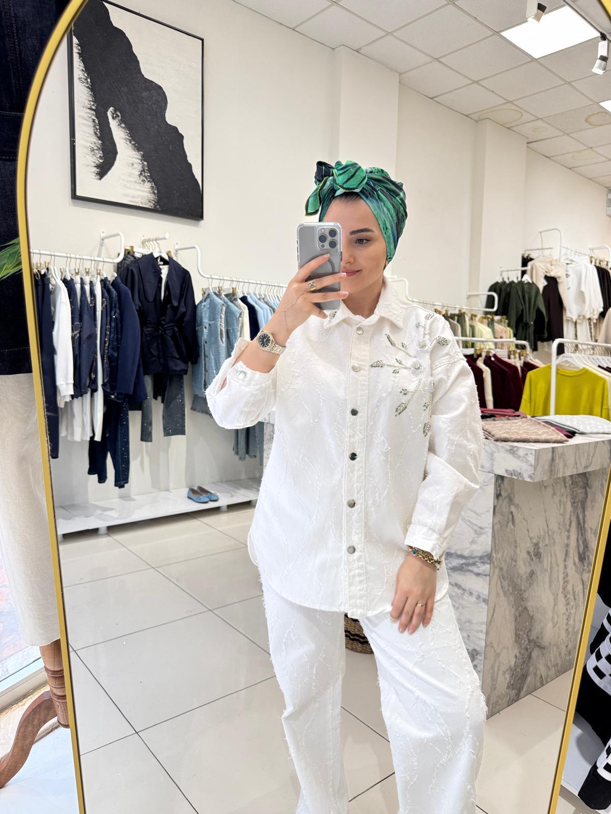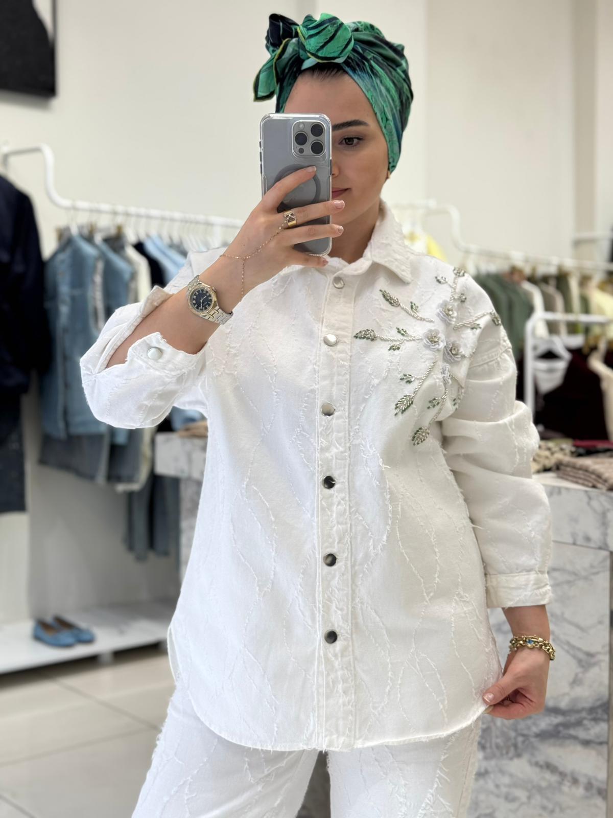 YAKA ÇİÇEK YAPRAK İŞLEMELİ DENİM TAKIM